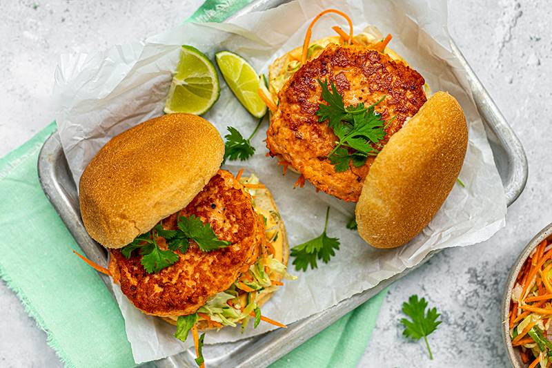 - Server lakseburgerne i lune hamburgerbrød med coleslaw og koriander.