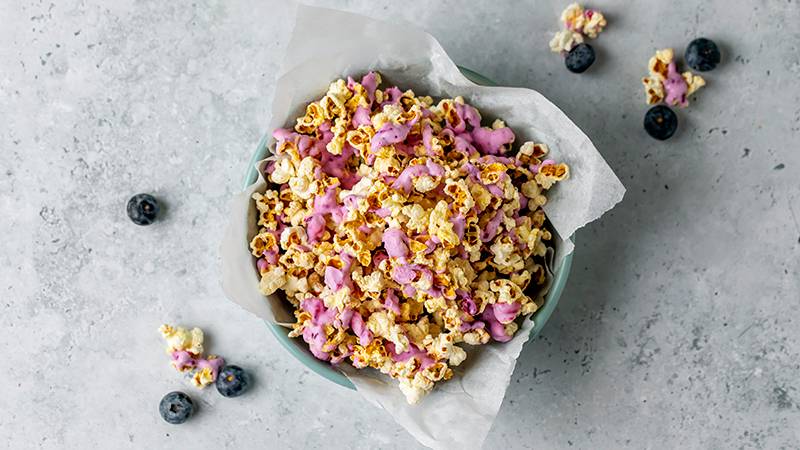 I denne varianten av frozen popcorn bruker vi yoghurt. Her er trikset å ikke bruke for mye yoghurt, du vil at popcornet skal være crispy, ikke vått. Popcornet tiner raskt når du har tatt det ut av fryseren, så frys gjerne ned i små porsjoner.