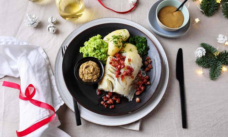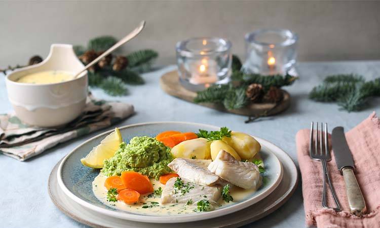 Sammen med lutefisken serverer vi oftest lutefiskbacon, mandelpoteter, ertepuré og hjemmelaget sennepssaus.