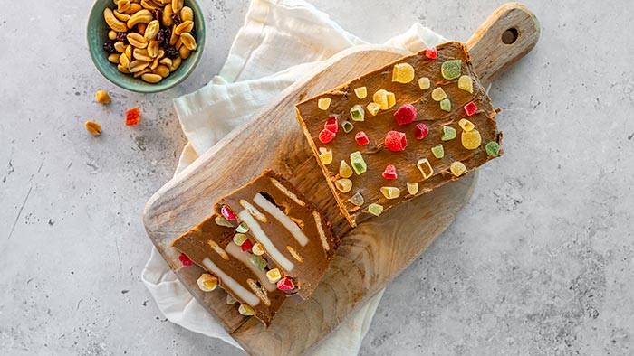 - Legg på skiver av marsipan, eventuelt flere kjeks og nøtteblanding.