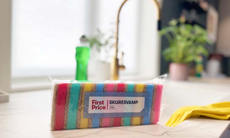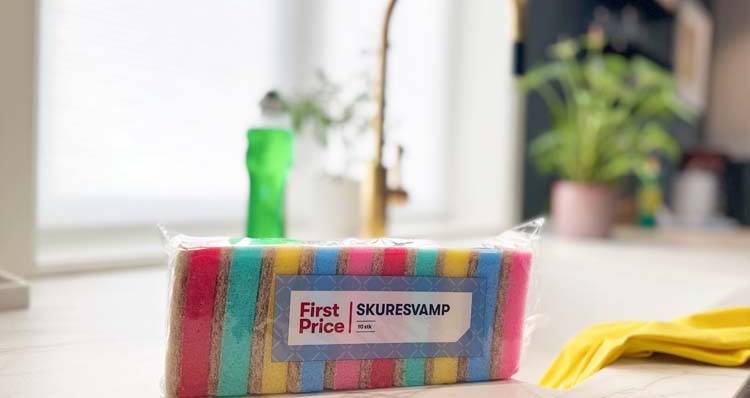 På First Price Skuresvamp har vi redusert tykkelsen på emballasjen med 20 prosent. Det gir en årlig plastbesparelse på 370,5 kilo. I tillegg er skuresiden av svampen nå laget med 50 prosent mindre plast, og den plasten som benyttes er resirkulert.
