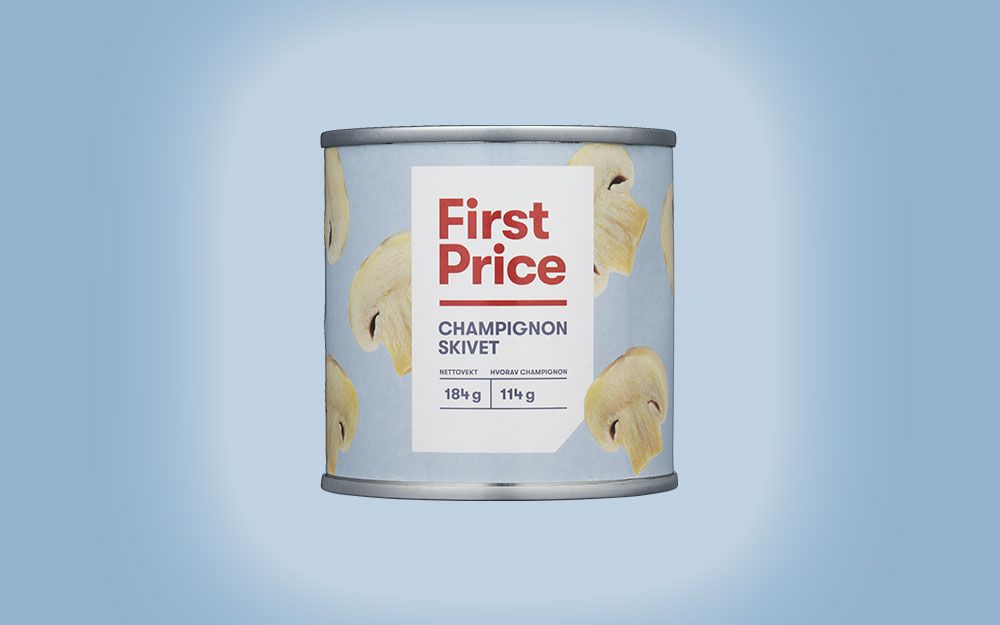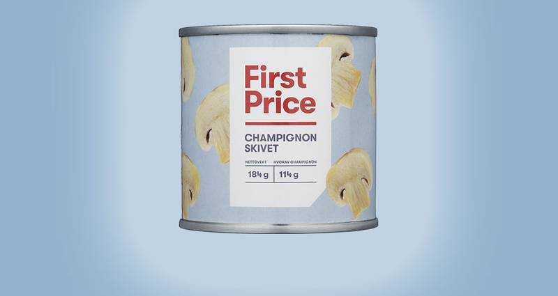 First Price Sjampinjon har fjernet plasten rundt trepakningen.