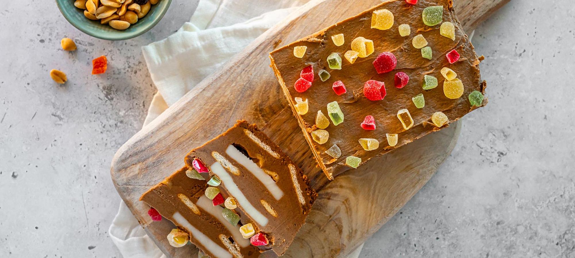 Gjenta annethvert lag med kjeks og marsipan til formen er full. Sørg for å avslutte med et lag sjokoladeblanding på toppen. - Pynt toppen med gelétopper eller grovhakkede seigmenn etter ønske. Du kan også drysse over nøtteblanding som pynt.